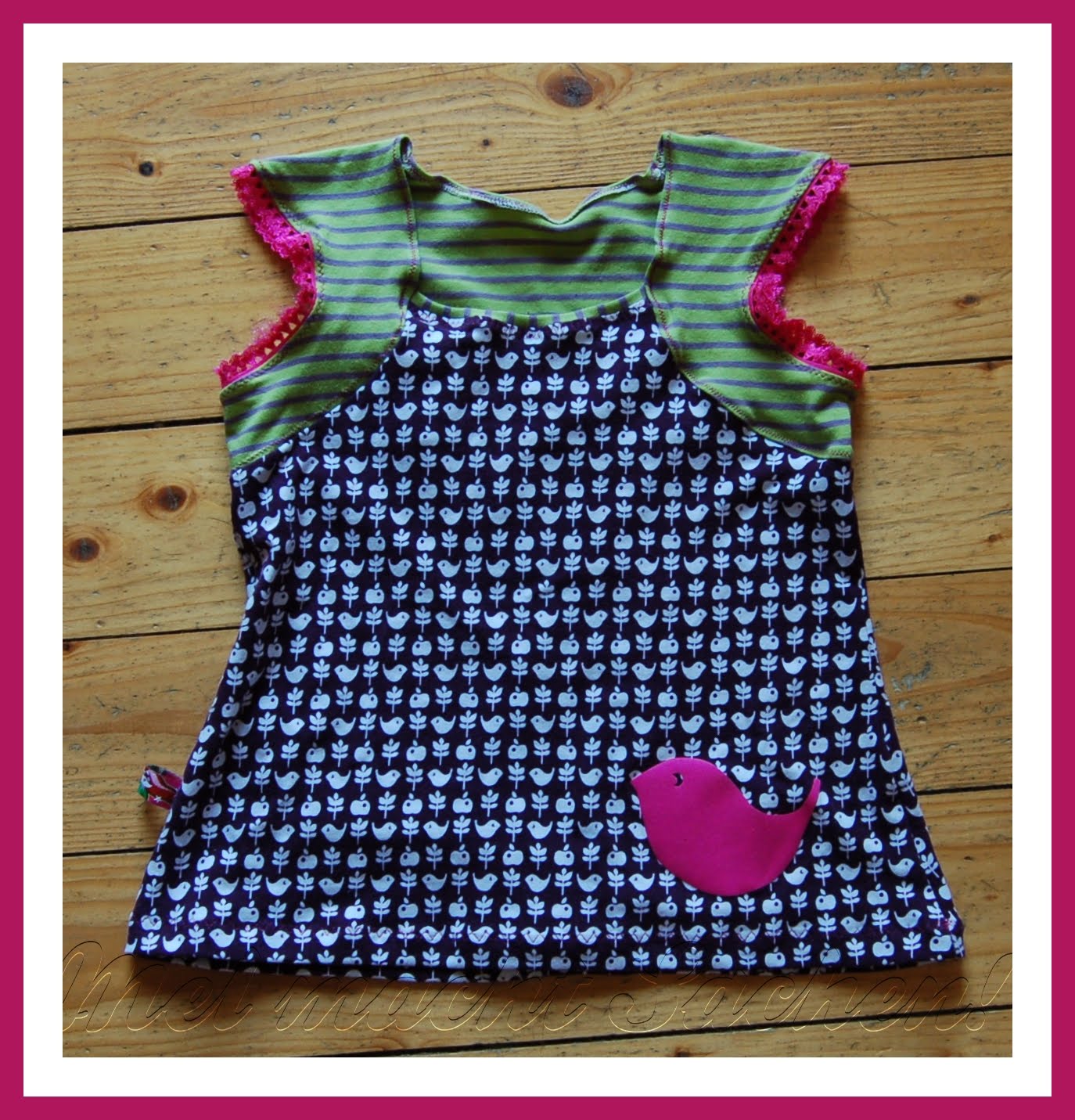 Dieses hier wurde noch ein schnelles Geschenk für den vierten Geburtstag eines kleinen Mädels. Quasi in letzter Minute fotografiert (stilvoll auf dem Bügelbrett, und hier und da hängt auch noch ein Fädchen…) und gleich verschenkt!